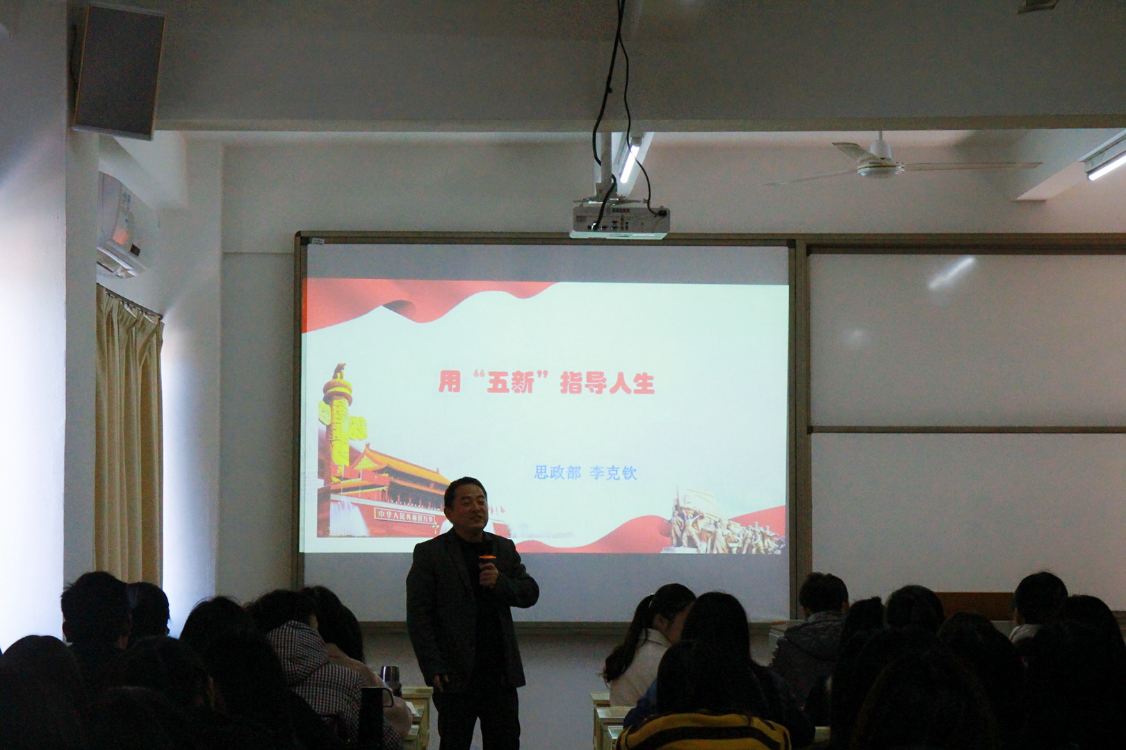 李克钦副教授以“用‘五新’指导人生”为主题,分别从“新矛盾、新时代、新使命、新思想和新征程”五个方面解读了十九大的丰富内容、深刻内涵和时代的意义。他指出“新矛盾、新时代、新使命、新思想”这四个新是“知”的层面,即需要我们去学习和领会;“新征程”是“行”的层面,即在学习了之后需要我们去落实行动;将两者结合,从而在新时代中国特色社会主义现代化建设中做到“知行合一”,不断地创出造辉煌的成绩。最后,李老师以习近平总书记在十九大报告中寄语青年一代的话:“青年一代有理想、有本领、有担当、国家就有前途,民族就有希望,中国梦是历史的,现实的,也是未来的,是我们这一代的,更是青年一代的,中华民族伟大复兴的中国梦终将在一代代青年的接力奋斗中变为现实,广大青年要坚定理想信念,志存高远,脚踏实地,勇做时代的弄潮儿,在实现中国梦的生动实践中放飞梦想,在为人民利益的不懈奋斗中书写人生华章”,鼓励在场的青年一代能够将自己的梦和实现中国梦相结合,将自己的梦融入到实现中华民族伟大复兴的中国梦中去,不断地拼搏和奋斗,不忘学习和进步,勇于担当青年一代的使命和责任。