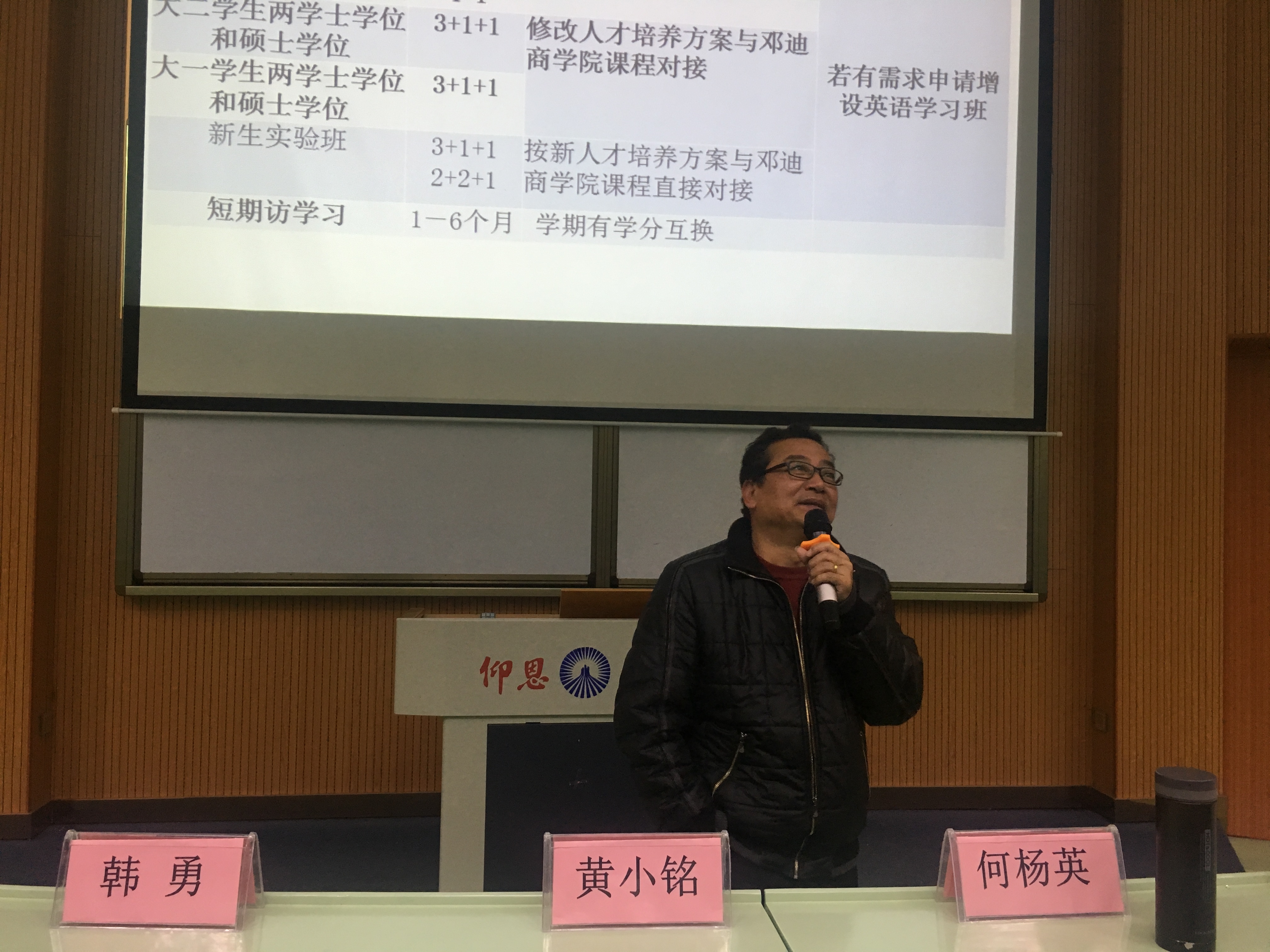 何杨英详细介绍了本次与英国阿伯泰大学邓迪商学院交流学习项目。她指出,本次项目在课程上是以ACCA和CIMA课程体系为导向,朝国际认证方向努力,为此开设毕业班学生攻读硕士学位的4+1模式、低年级学生攻读两学士学位和硕士学位的3+1+1模式、新生实验班的3+1+1或2+2+1的学习模式。同时,她强调赴英交流学习对于英语能力要求较高,希望同学们提前准备雅思等相关英语能力考试,提前闯过语言关。