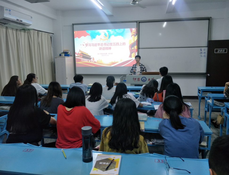 2019年5月6日晚上7:30,beat365官方网站学生第一党支部,于吉龙楼203教室开展“学习习近平总书记在纪念五四运动100周年上的讲话精神”交流分享会。