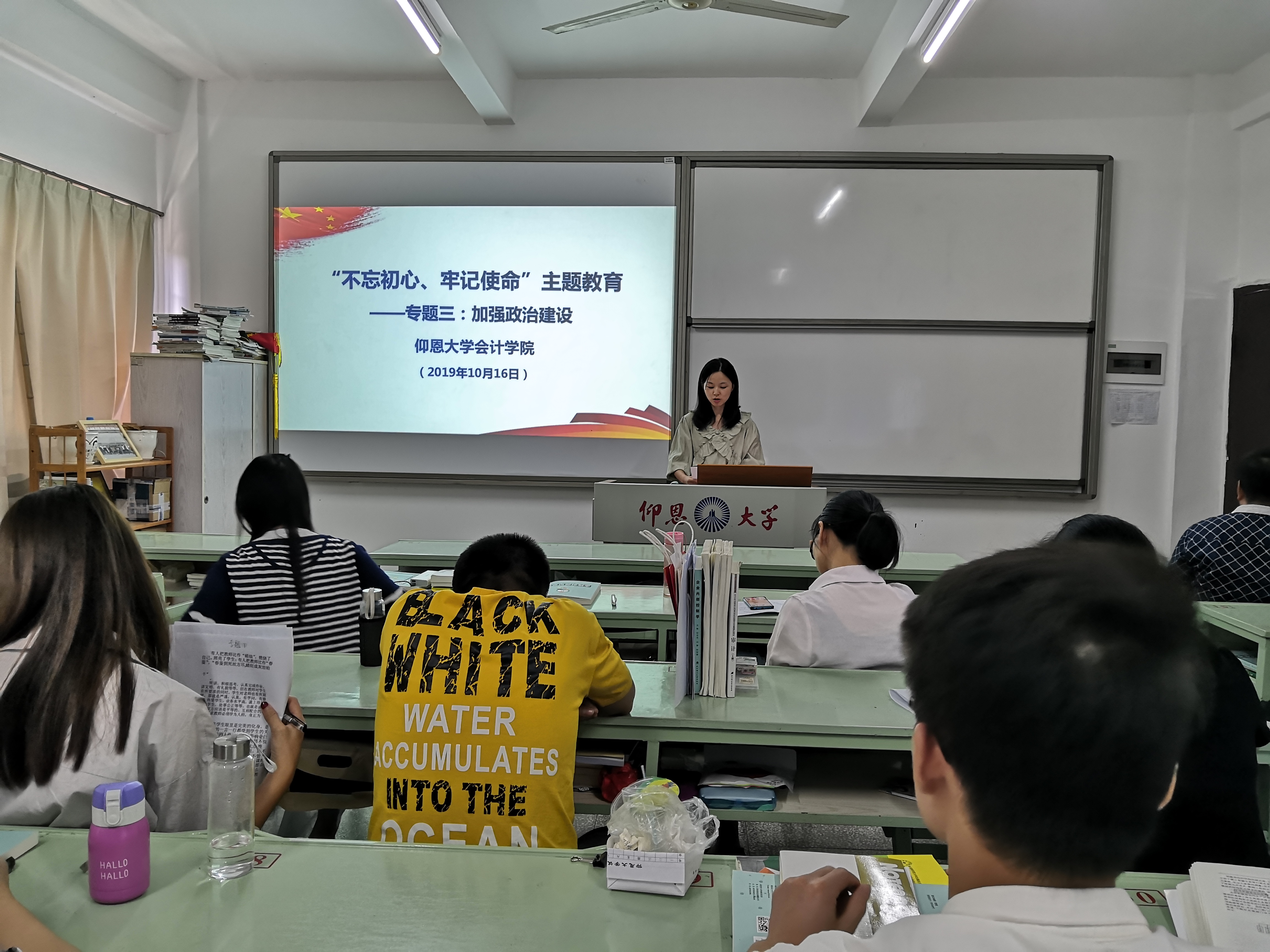 2019年10月16日下午2:30,beat365官方网站党总支在吉龙楼108教室召开“不忘初心、牢记使命”主题教育专题三“加强党的政治建设”学习研讨会,学院全体教师党员、学生党员代表参加会议。