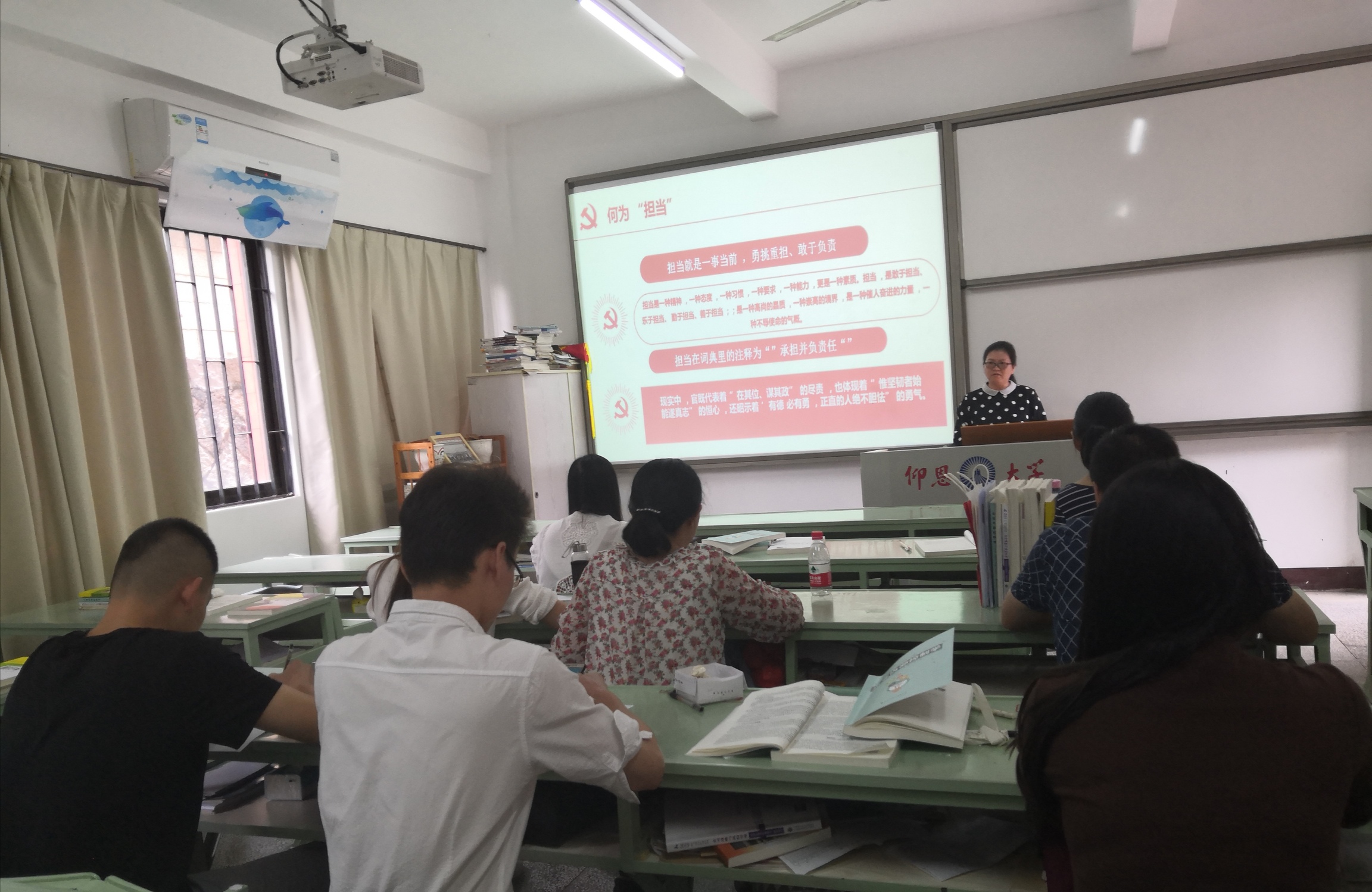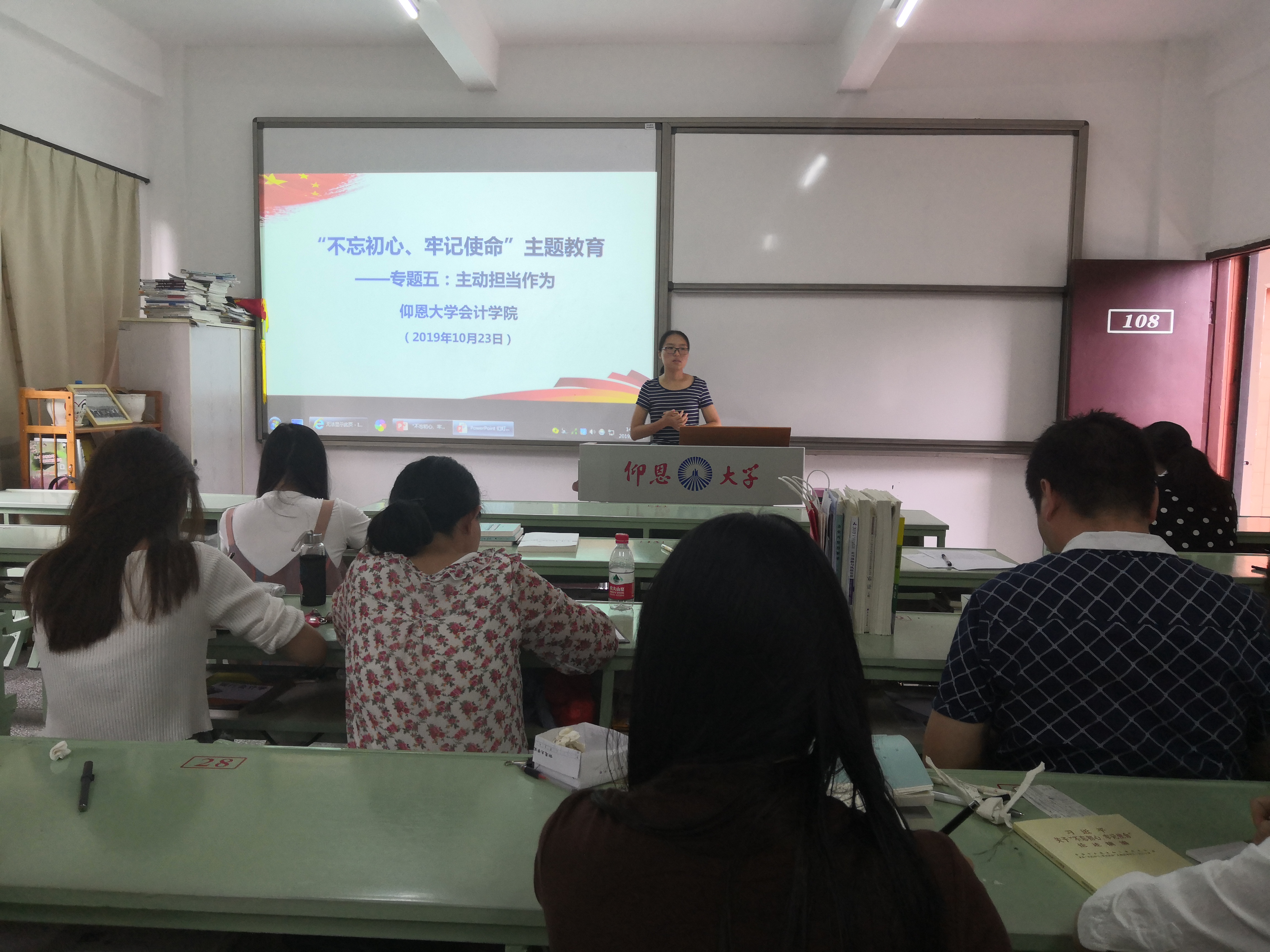 2019年10月23日下午2:30,beat365官方网站党总支在吉龙楼106教室召开“不忘初心、牢记使命”主题教育专题五“主动担当作为”学习研讨会,学院全体教师党员、学生党员代表参加会议。
