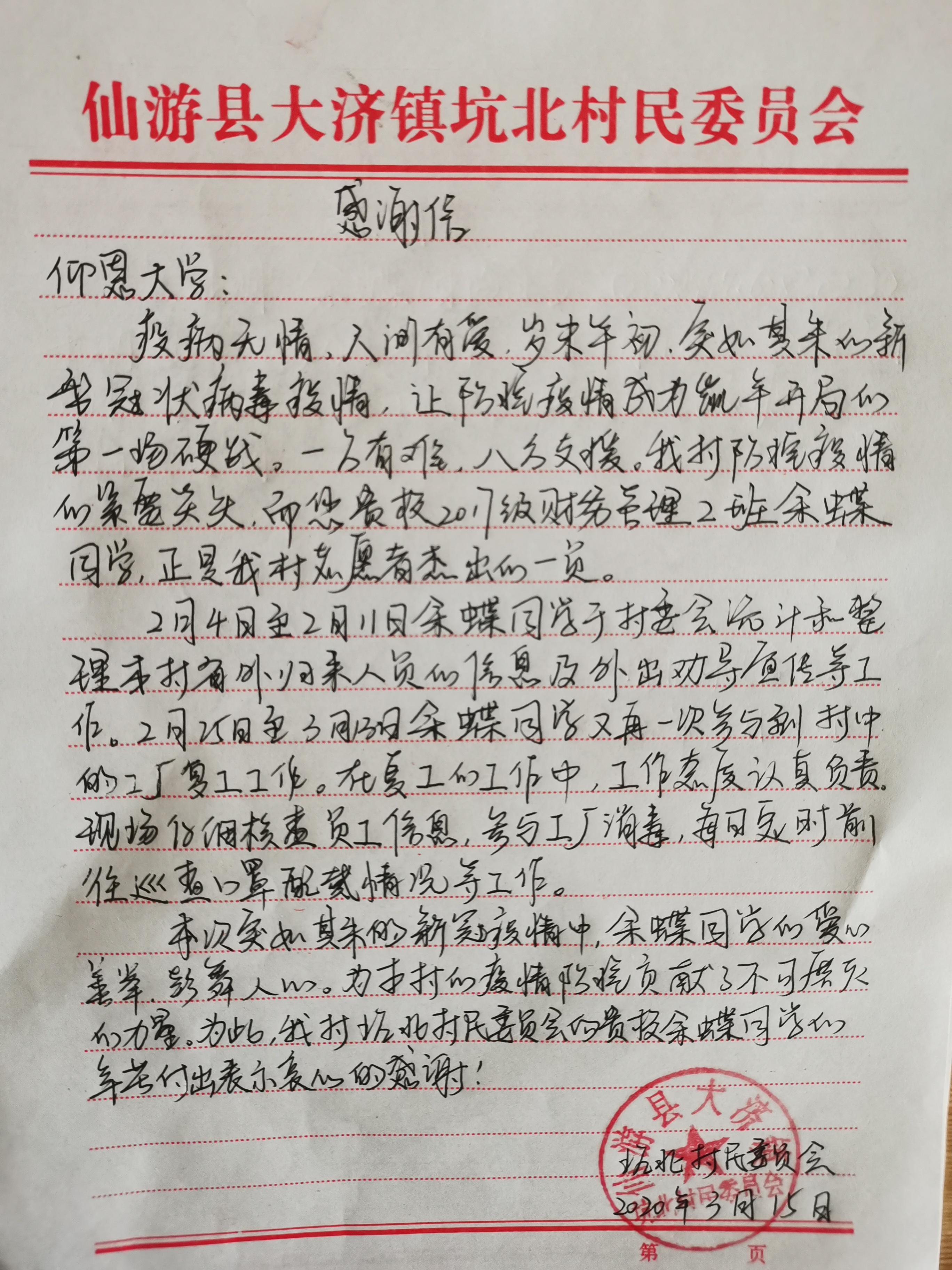 18级会计1班陈玲珊积极投入到村组织的抗疫工作,在村里防控卡点,对过往行人测量体温、讲解隔离及防疫知识;18级财务管理1班王建宁参与村里的防疫工作,进行拦车检查、对未佩戴口罩的村民进行劝诫、登记出入人员信息等;18级财务管理2班陈淑怡参与社区与检察院联合发起的志愿宣传活动,深入社区,向居民发放防疫宣传单和手册,普及防疫知识;19级会计1班游伟达、19级会计2班卓惺俊作为退伍军人,以“为人民服务”的精神,在村口执勤站岗,对出入人员管控登记;19级会计2班杨思琦作为班级的团支书,带领班级同学以创新形式开展关于抗疫的主题活动,并制作疫情知识宣传视频,为更多人普及疫情防控知识。除此之外,全院共计二十余人积极投身当地防疫志愿服务之中,用实际行动彰显新时代青年学生的风采。