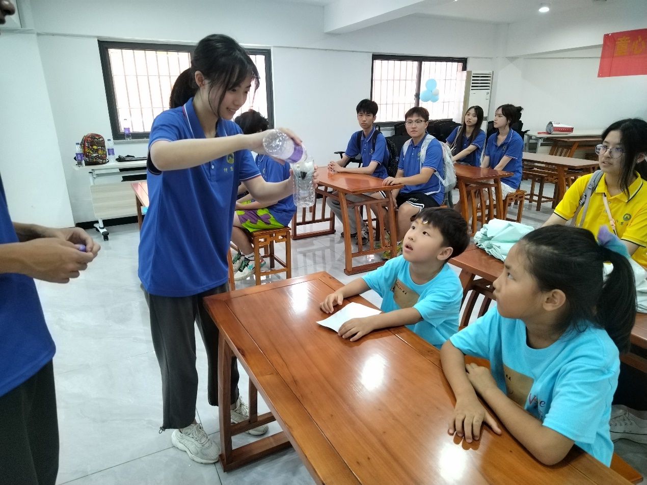 实践队员给小朋友演示自制滤水器