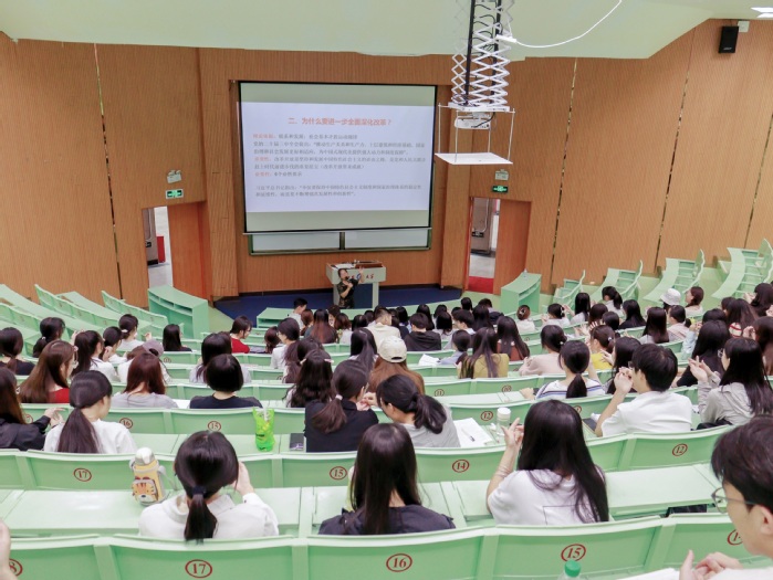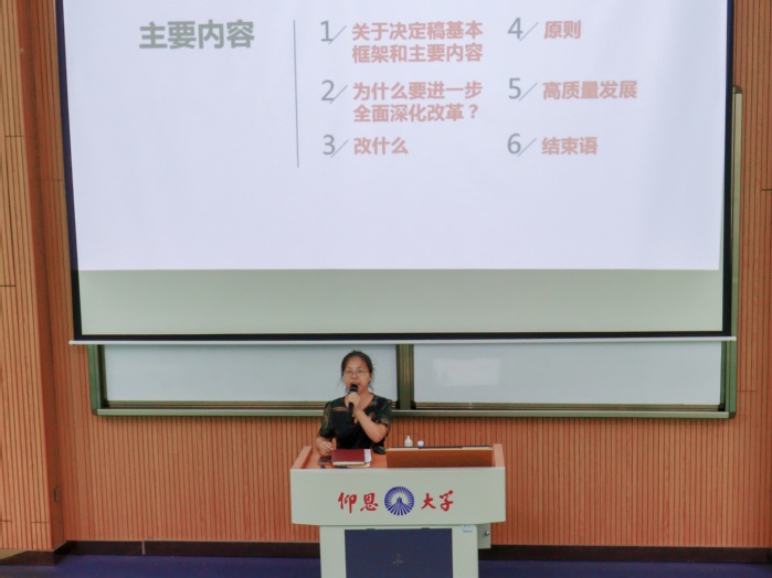 宣讲伊始,杨丽娥副教授首先向与会师生简要介绍了《中共中央关于进一步全面深化改革、推进中国式现代化的决定》的基本框架和主要内容,使大家对全会精神有了初步的了解。随后,她深入剖析了当前国内外形势,阐述了进一步全面深化改革的重要性和必要性。杨老师指出,中国要前进,就要全面深化改革开放;除了全面深化改革开放,别无他途。在宣讲过程中,杨老师特别强调了改革的重点和方向,她结合生动的案例,深入浅出地讲解了为什么要改、改什么以及怎么改的问题。这些案例既有理论深度,又贴近生活实际,让与会师生深受启发,对全会精神有了更加深刻地认识。