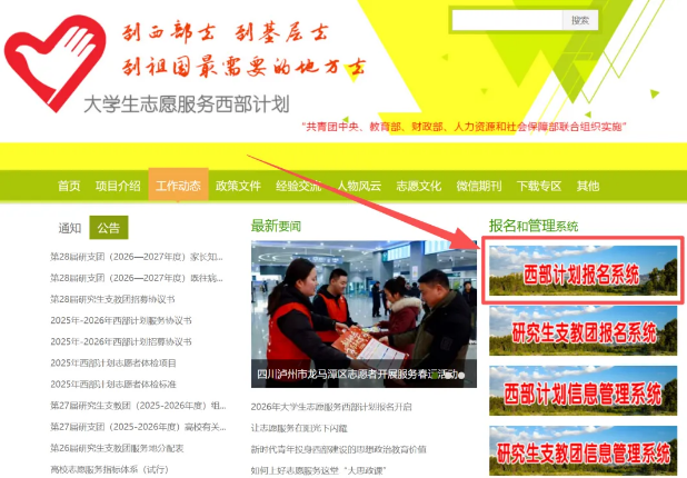 3月1日至5月10日,2026年普通高等学校应届毕业生或在读研究生,可登录西部计划官方网站(https://xibu.youth.cn)或通过“西部志愿汇”微信公众号(菜单栏中的“我要报名”),在西部计划信息系统(https://west.youth.cn/login)中完成注册报名。